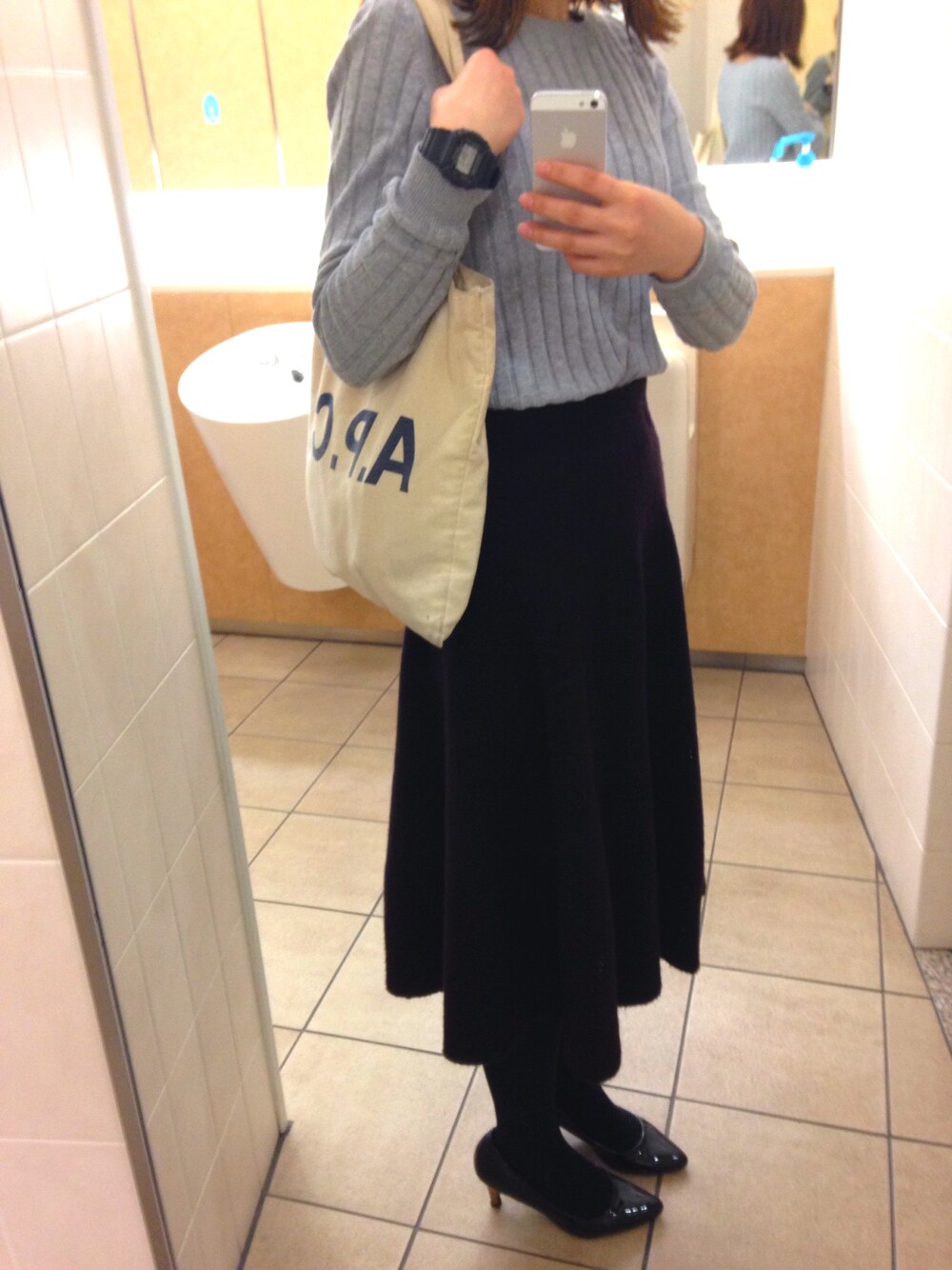その他のスカート、グレー系のニット/セーター、ブラック系のパンプスを着用したレディースの秋コーディネートの1枚目の写真