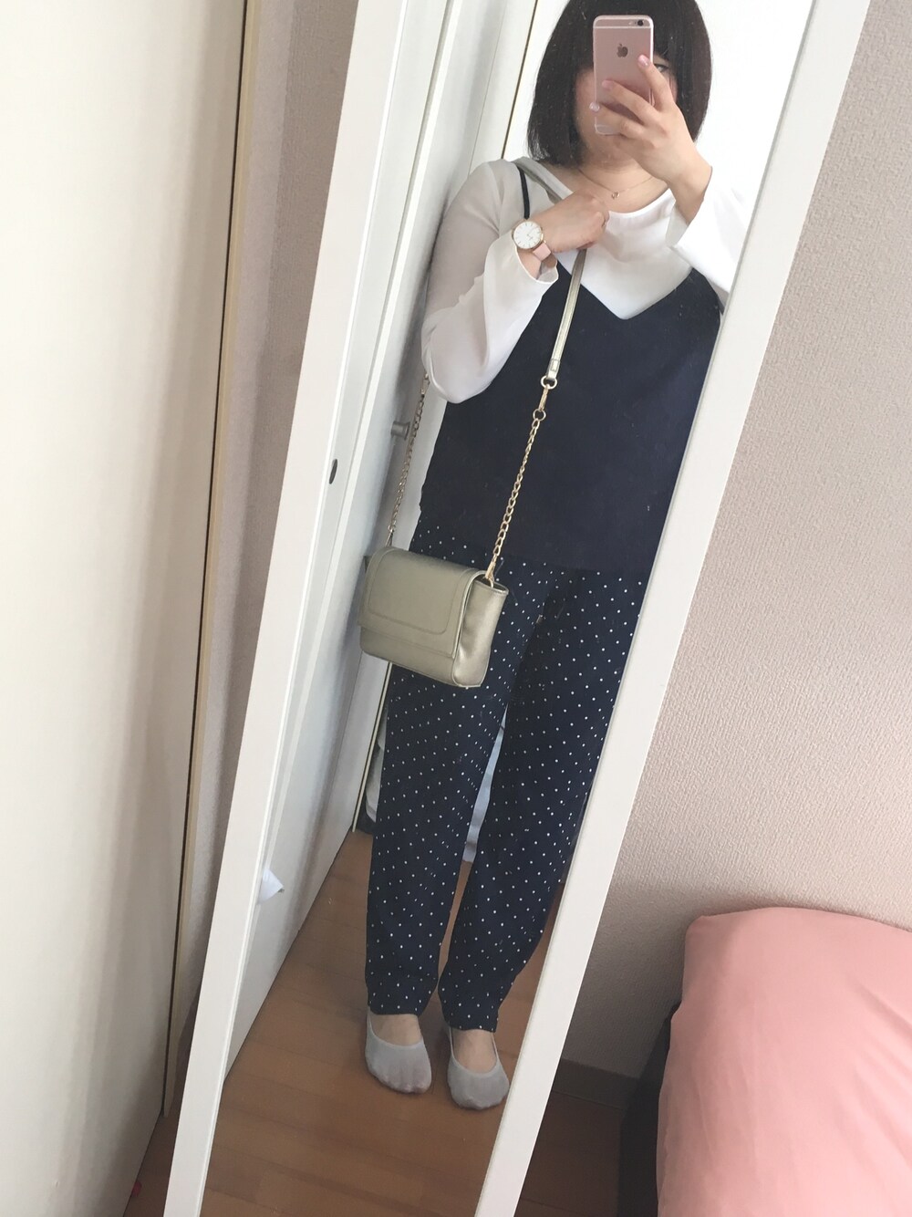 今日は浅草昼飲みデート♡ ビールケースに座っても気にならないようにネイビーパンツ。ドット柄がかわいいなぁ。 カバンはjoliechambreのショルダーウォレット。お財布兼用なのにたくさん入るから良い感じ!
