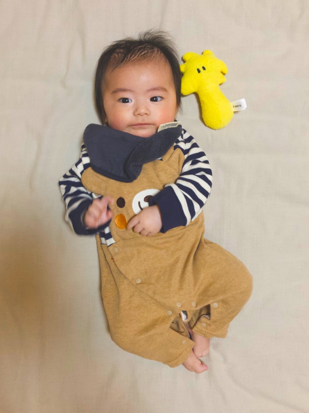👶🏻「初めての投稿で緊張のぼくでしゅ」 🐥「ちゅ❤︎」 🧑🏻「ロンパースとスタイをネイビーで合わせました。MARKS&WEBのスタイは厚めでお気に入りです」