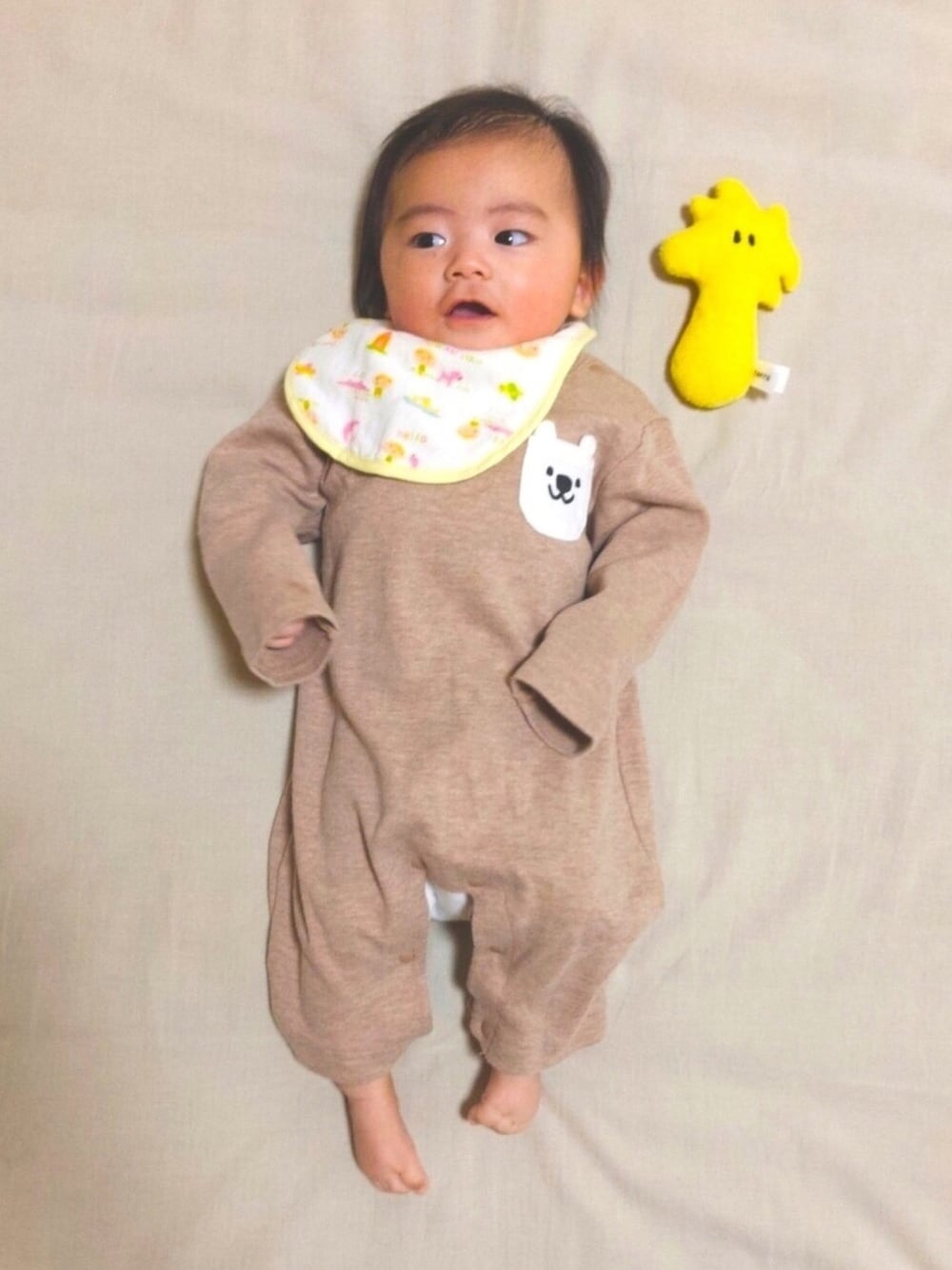 👶🏻「目線をはずすテクニックでしゅ」 🐥「ス、スゴイ!」 🧑🏻「おしりにもしろくまがいて可愛いロンパースです。総柄のスタイを合わせてアクセントをだしました」