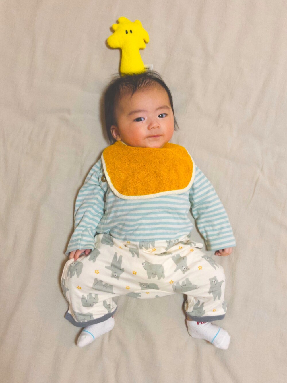 👶🏻「おでかけしてきましゅ(`・ω・´)」 🐥「ニョキ🌱」 🧑🏻「スタイはリバーシブル(多分)で、裏はネイビーです。ロンパースの黄色い星とリンクさせました。とっても可愛い靴下はお安くなっててラッキーです✌️」