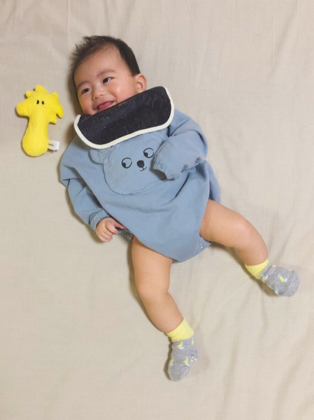 👶🏻「あ、お父ちゃんだ!」 🐥「アー!」 🧑🏻「あばれる君みたいなくまで面白い、ってことでいただきました💙この服に合うタイツが欲しいなー!」