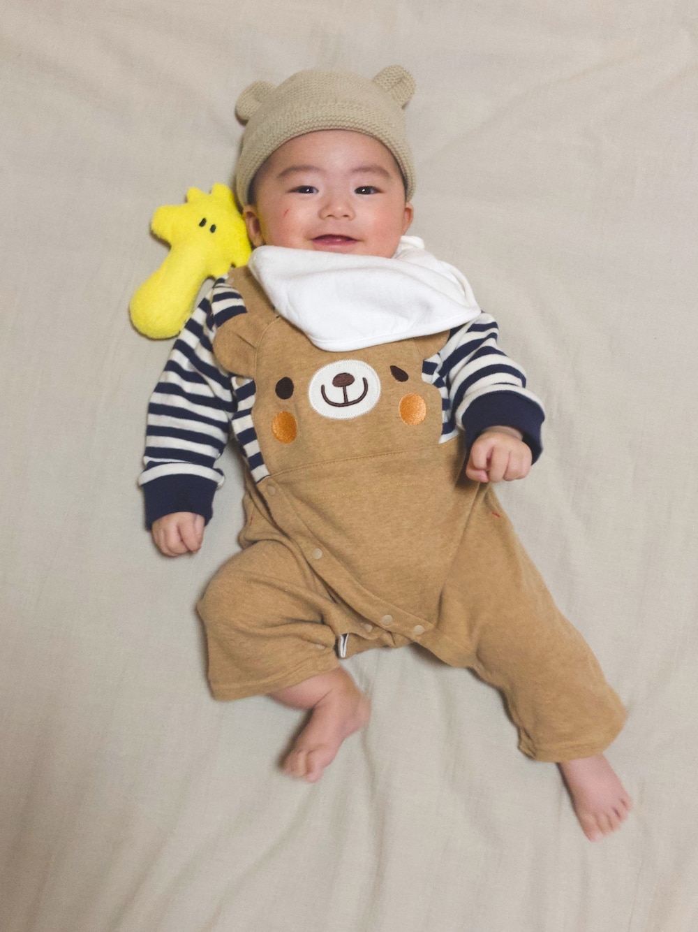 👶🏻「お母ちゃん僕何かぶされたの?」 🐥「クマサンニナッタノ?」 🧑🏻「洋服もくまで帽子もくまで、男の子はくまのモチーフが多いですね〜〜〜ʕ•ᴥ•ʔ」