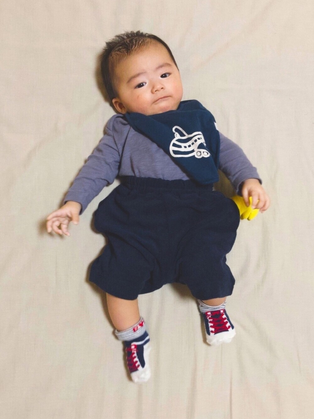 👶🏻「切ない表情もできましゅ」 🐥「ボクミエテナイ💦」 🧑🏻「スタイはリバーシブルで裏は恐竜の絵になってます✈️バースディのロンパースは、長袖着せにくいかなと思いきやめちゃ伸縮性あります🙆🏻♀️」