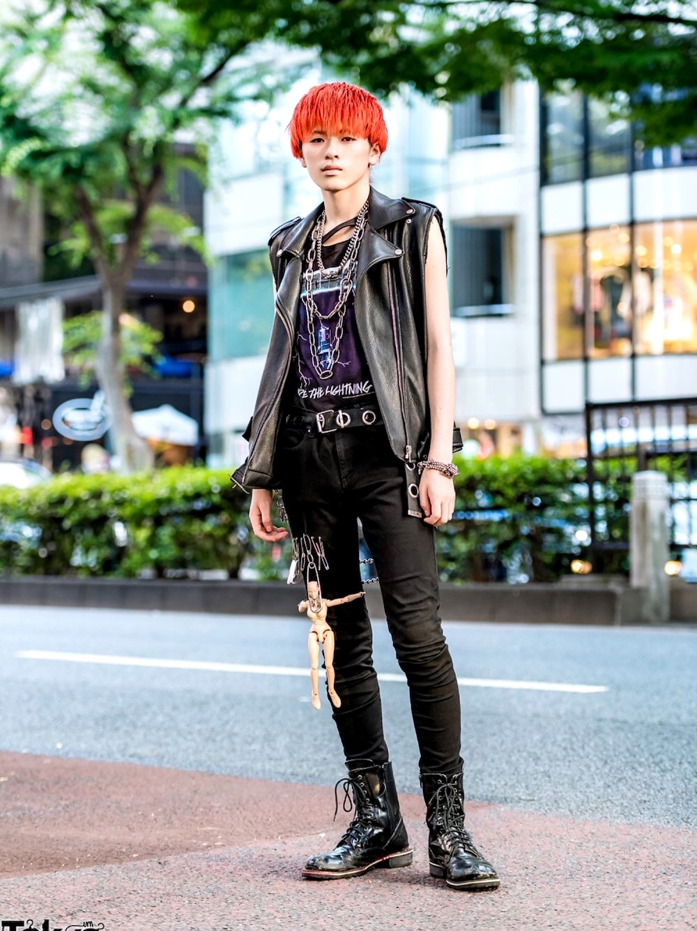 久々の投稿です tokyo fashionさんにスナップされた時のもので。 夏のワントーンコーデということで今回はオールブラックのパンクファッションです トップス、ジャケットはハサミでリメイクしてド派手なスタイルを。 プチプラ激安パンクコーデに。 今回のポイントは足についたフィギュアです。こいつが最高のアクセサリーです。