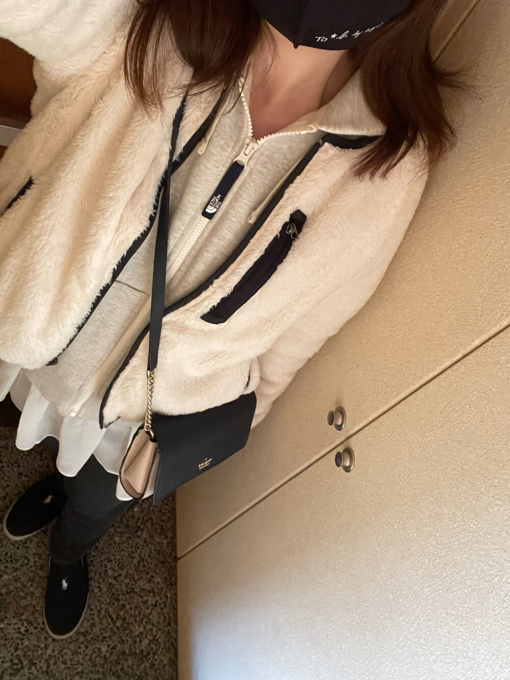 #きのコ 数年前に流行った、ノースフェイスのリアビューフルジップフーディー、前を閉じてプルオーバー風に。 これも、裾フリルタンクと合わせて✨