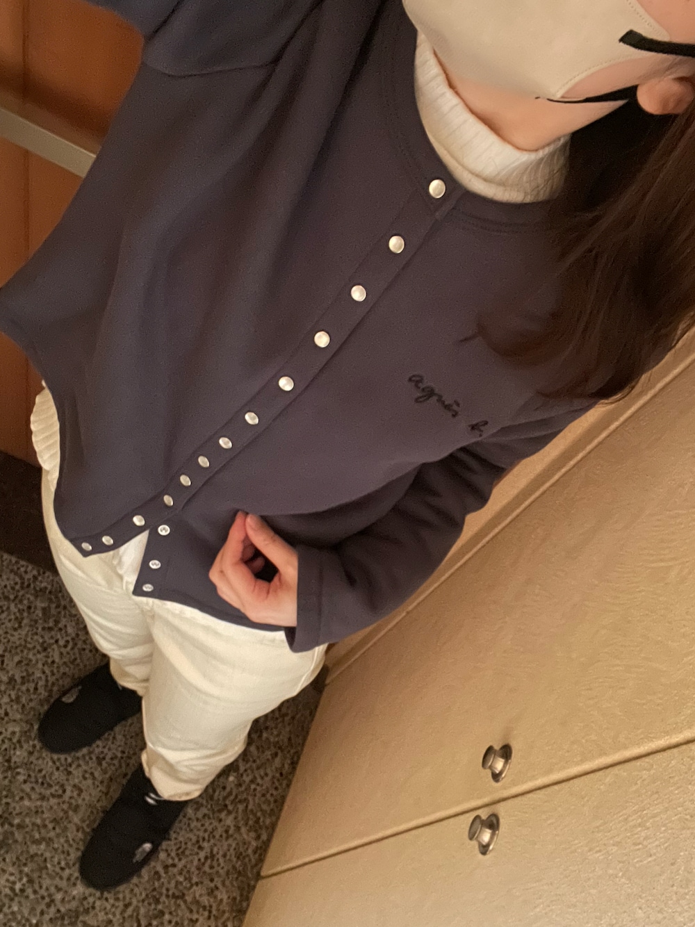 息子と実家へ🚘 数年前のアダムエロペ別注アニエスベーのスナップボタンカーディガン🫰 薄手のハイネックニットと重ね着🧶 相変わらずの、裏起毛デニムにヌプシ。早く暖かくならないかな🌸