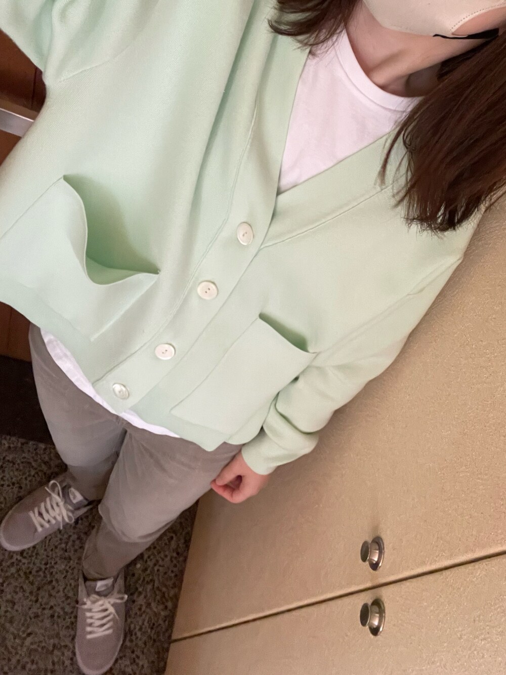 参観日コーデ。 21℃。 基本、学校は、他より寒いし、暑いしなので、ロンTにカーディガンをレイヤード🌸 ピスタチオグリーンのカーディガンで春らしく🎶