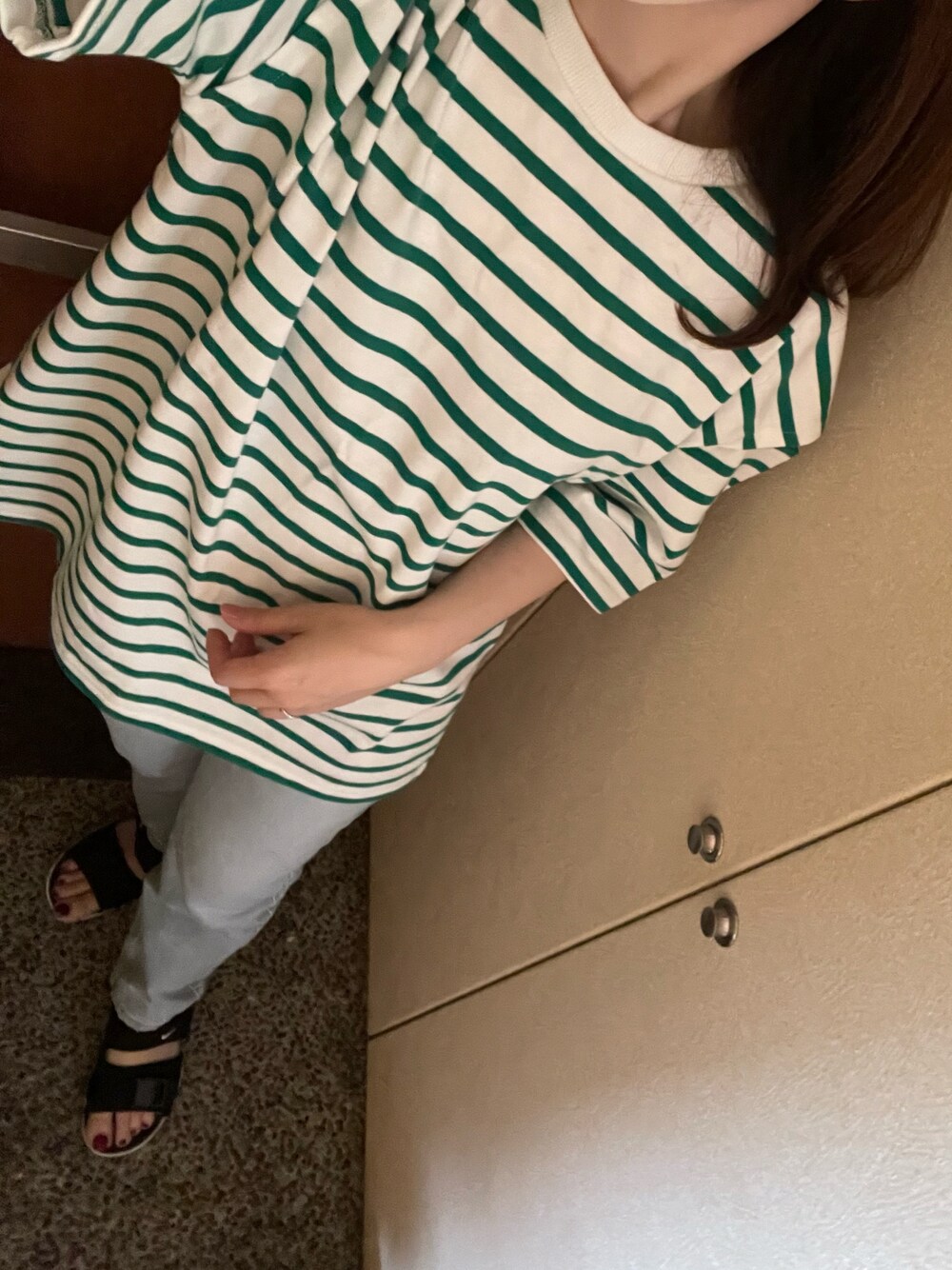 28℃/13℃ スーパーとお迎えのみ🚗 ショルダースリットとグリーンボーダーが❤️ 生地が少し厚めで、5部袖なので、真夏は暑いかな💦 買ったばかりのupper hights THE NINETY カラーは、REEF。 淡いブルーが夏って感じ☀️