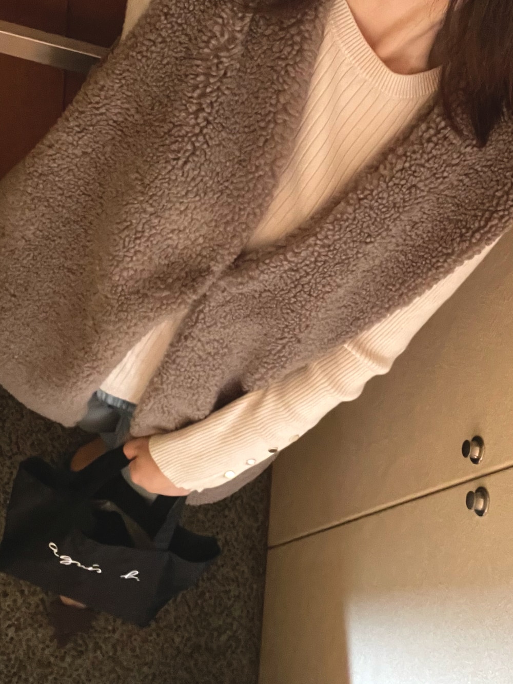 19℃8℃ ☀️ 昨日買ったばかりのボアジレ✨ ジレのインナーにピッタリな、ボタンスリーブのニット。私のは2年前に買った、一番初期のもの。今年も出てる✨少しスレが気になるから、そのうち買い替えようかなー。 アニエスベーのバッグは、サブバッグに⭕️ ジレに、ヒール、細身👖、いつもよりスタイルアップ⤴️なコーデ✨ 朝冷え込むようになってきたけど、まだ床暖房つけてない。去年はもう、つけてたみたいで。やっぱり、暖冬? 昼間、運転してたら、ポカポカ✨