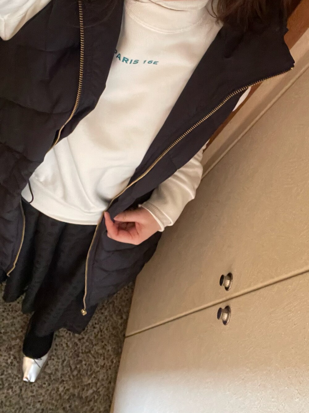 18℃ 1℃ ☀️ 息子と実家へ。今日も日中はあったかくて、2月とは思えない✨ スウェットにシアータートルレイヤード、スカートは届いたばかり✨ドットチュールがめちゃくちゃ可愛い❤️ ダウンジレで、縦長ライン強調⭕️
