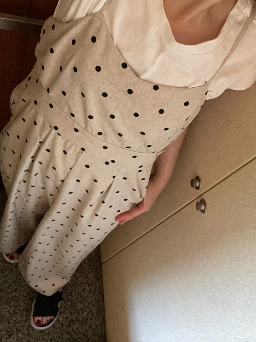 暑かった💦けど、まだ朝夕は、マシかな。 ベージュにブラックドット、そして、サロペットなのが、すごく好み💕サラッとした生地のワイドパンツなので、暑い日も快適✨インナーは、コンパクトなフレンチスリーブで、もたつきなし⭕️ココで、さらに脚長効果✨