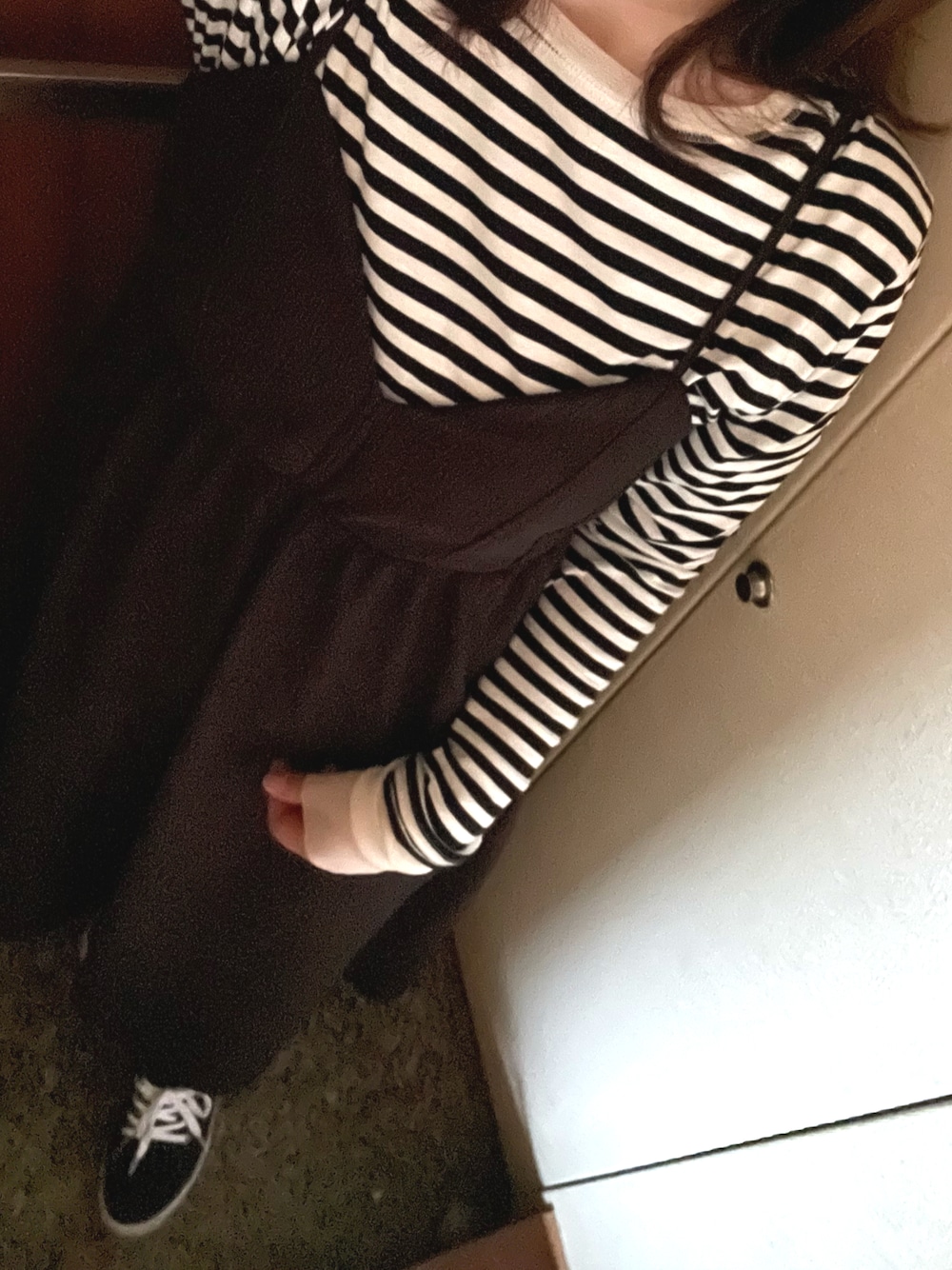 平日休み、掃除にスーパー買い出し、図書館行って、雨なので👦の送迎🚗 ぐっと気温下がったので、この秋初長袖✨ 数年前にホワイト買って使えるから、ボーダーを、追加💕 ラクチン可愛い、ハートカットワンピ💕
