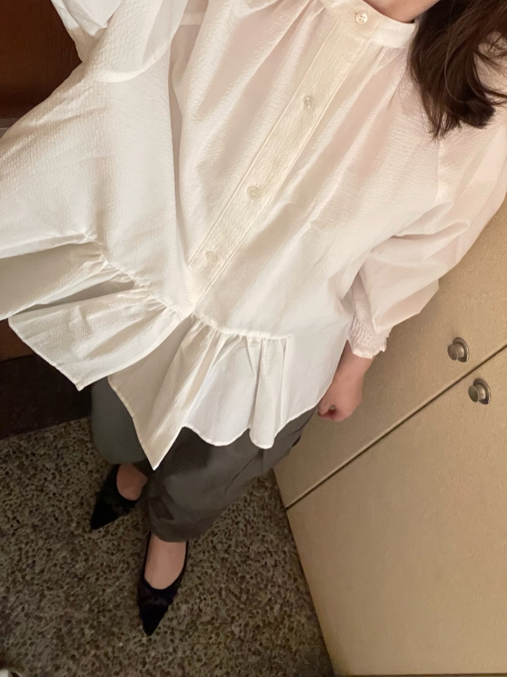 先日の平日休み、銀行、図書館、スーパーへ🚗 Tシャツでは、季節感おかしいし、ニットは暑いしな中途半端な季節には、ブラウス✨ 春に予約注文してたけど、届いたら暑くて着られなかったブラウス🎵少し袖短めなのも、今の時期に⭕️袖口シャーリングとペプラムで甘めなので、カーゴパンツ合わせて。