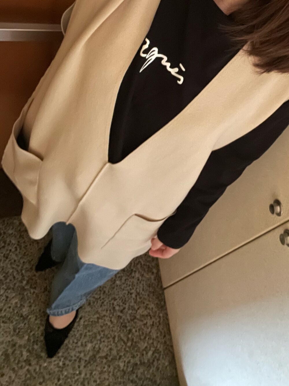 きのコ。息子と実家へ🚗 ベイクルーズアウトレットでポチった👖がお初✨ ヒップまわりのムチムチ感が気になって、ベストと合わせたコーデにしたけど、半日ほど履いてたら、伸びて気にならなくなった⭕️ 伸びやすい生地っぽい。 サイドのスタッズがかわいい🩷