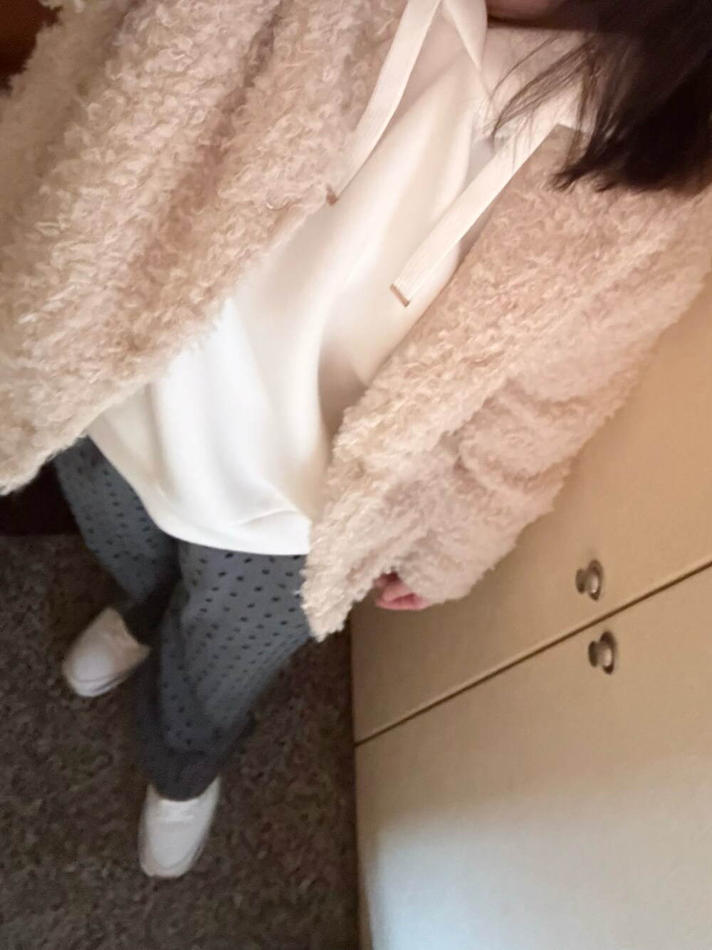 スーパー行くだけ。 3月中旬だけど、寒の戻り? 今日は寒い🥶 ドット柄パンツに、レギンス合わせて、しっかり足元防寒✨