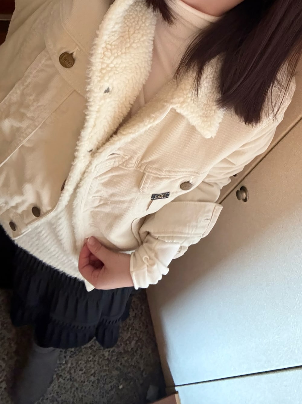 最近ずーっと冬らしい寒さだったから、日中ポカポカで嬉しい☀️ 平日休みの今日、👨と先日テレビで紹介されてたうどん屋さんで、ランチ🍽️アフタヌーンティーの期間限定、カルピスバターを使ったあんバターサンドを買って帰宅。 ボアのGジャンは、妹からもらったもの。細身なサイズ感なので、これまた買ったばかりの薄手のタートルネックニットにフェザーベストを合わせて。