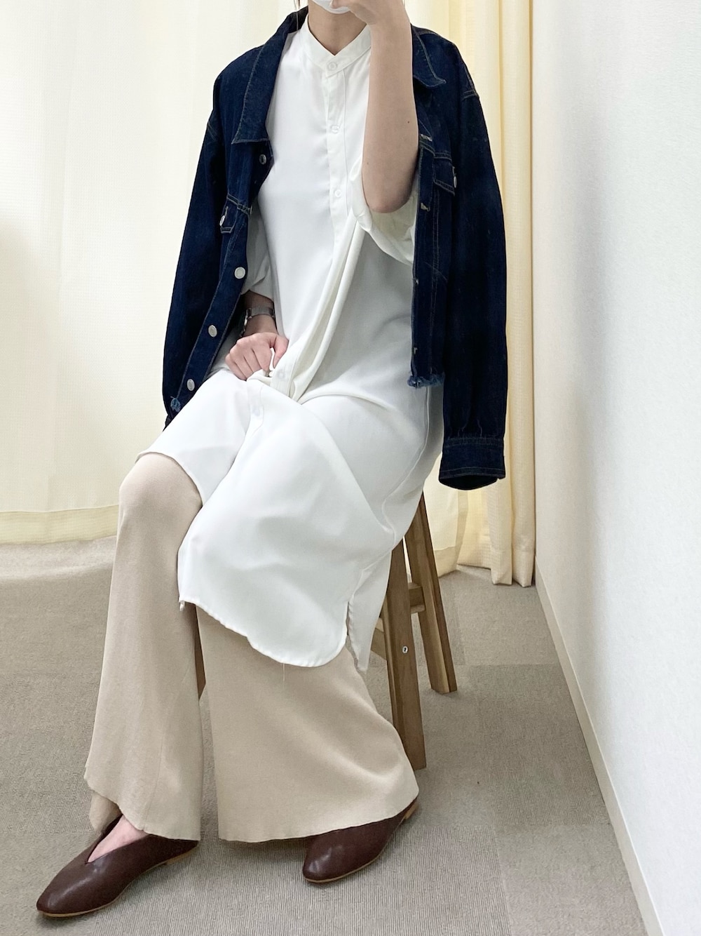まだ少し肌寒いので サラッとジャケット羽織ってます♪ 足元はVカットのフラットパンプスで 色が濃いブラウンでコーディネートを 締めてくれるので重宝してます☺️✨