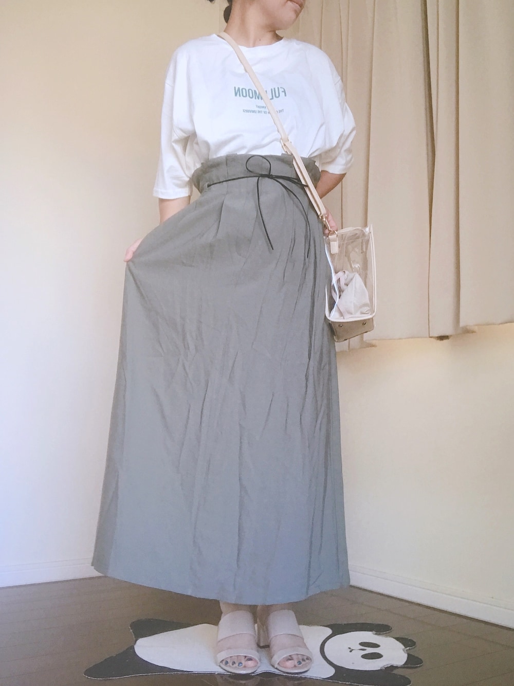 GUのくすみグリーンのロンスカ♡ スカートコーデ初や( ゚д゚) スカートの色とピアスの色、サンダルとバックの色それぞれ合わせてみた☺︎ 毎日暑すぎ!皆さん熱中症には気をつけましょう!