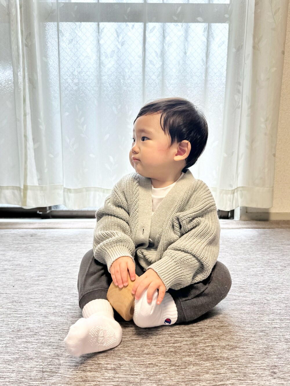. ざっくりガーデ ベビーが着るとかお洒落すぎ ボタンは1番上だけ開けて肩を落として ゆるっと着るのがかっこいい 今日もGAPコーデ グレーのグラデーションコーデ 大人みたい インナーは無地のロンT とことんシンプルに。 コーデがシンプルなので靴下はchampion 靴下でアウトドアな雰囲気を出す アウターはユニクロベビーのモコモコ 外遊びで汚れても 今しか着れない可愛さを優先🤍
