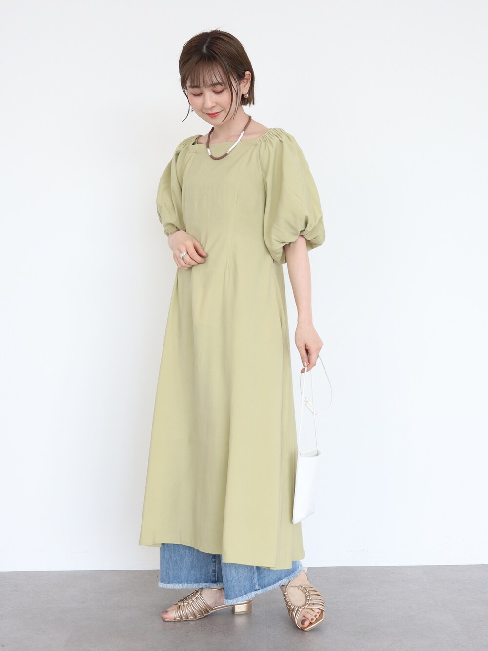 ボリュームのあるお袖がかわいいワンピース。 二の腕をさりげなくカバーしてくれる嬉しいアイテム。 肩紐を使ってオフショルで着られる2way仕様。 私はデニムのバギーワイドパンツとレイヤードしてカジュアルにスタイリングしました!