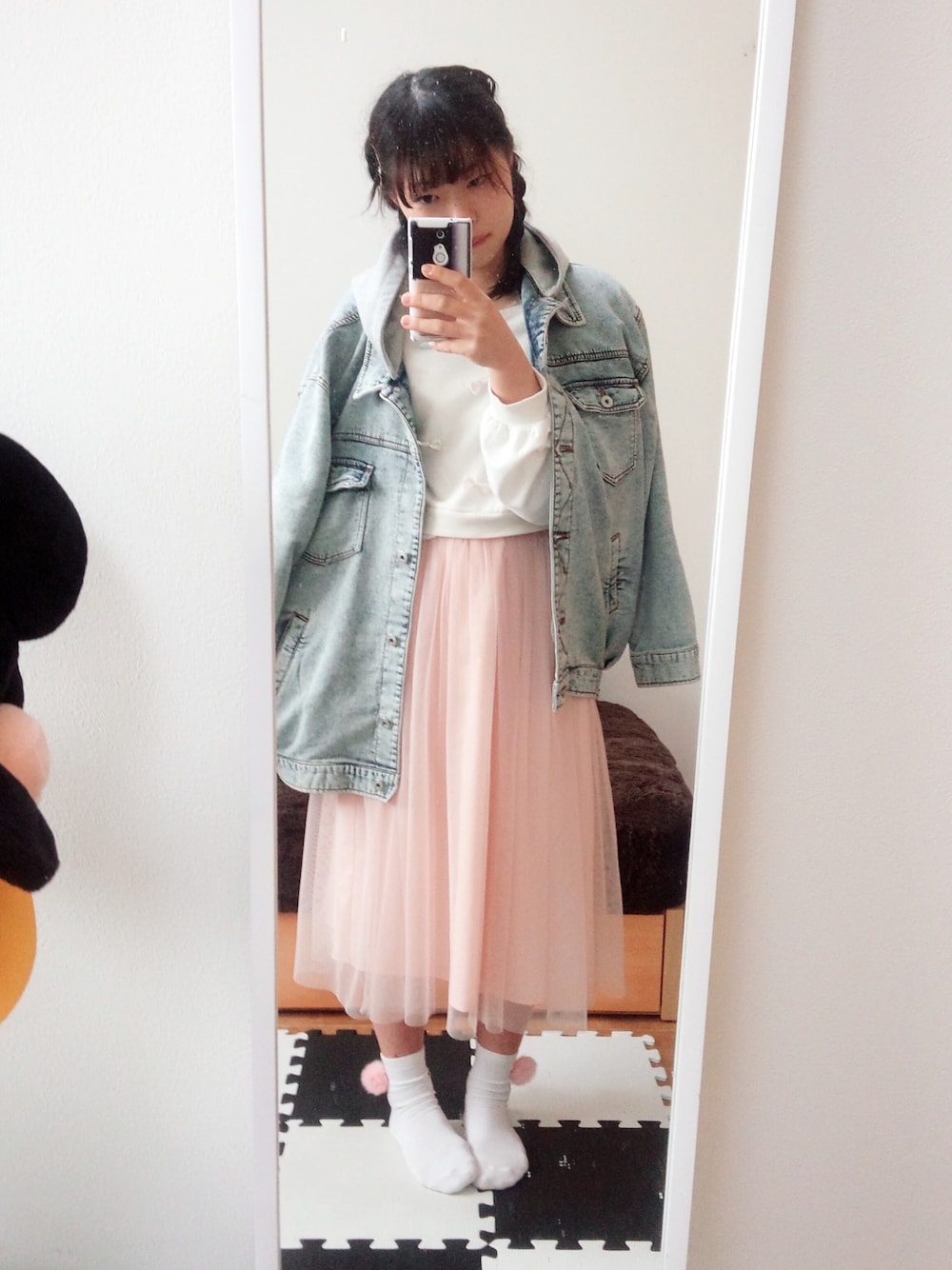 ピンク、白のコーデにミリタリーデニムでアクセント💫