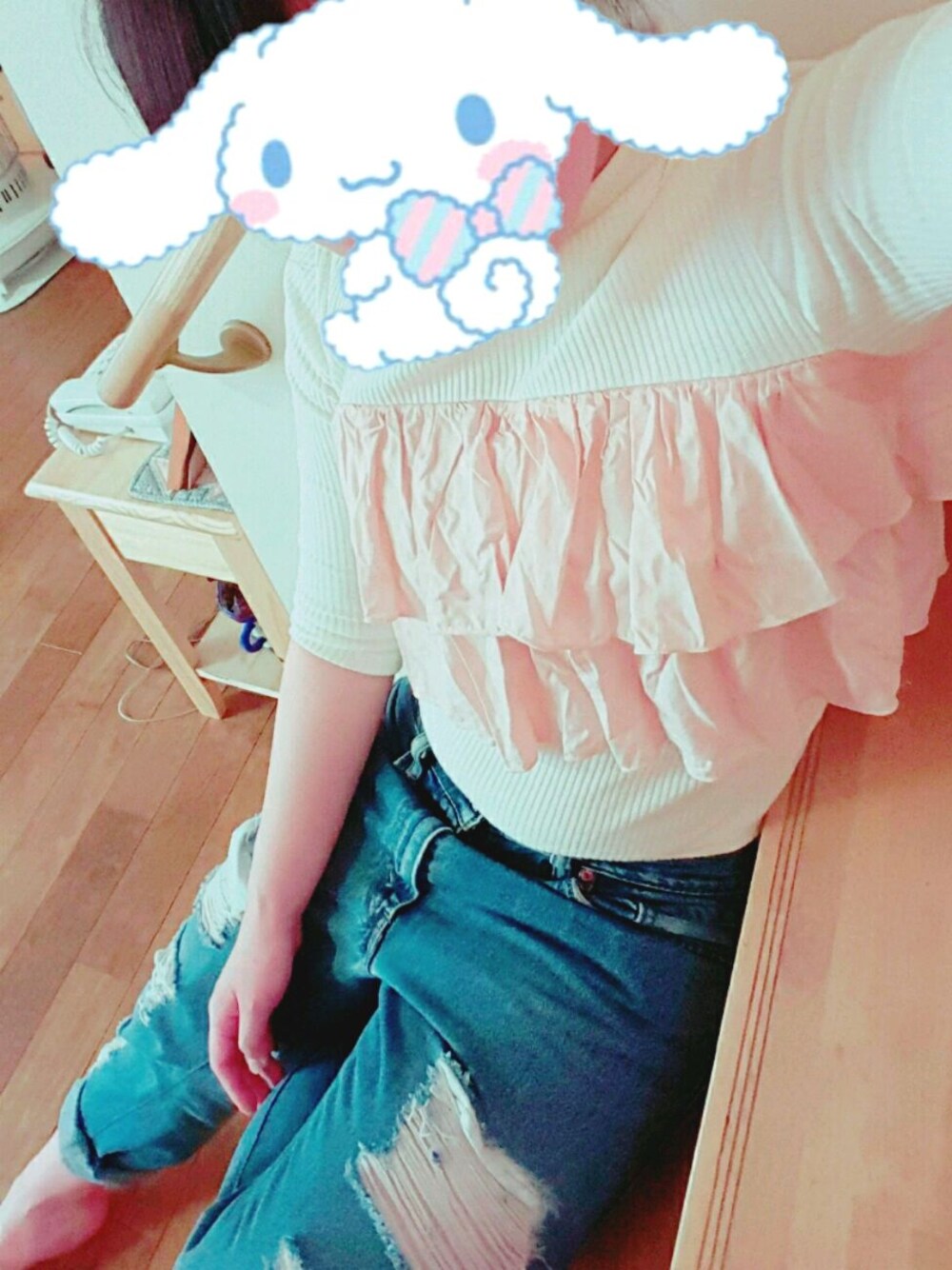 . . . らくちんこーで。フリルTシャツとダメージジンズがお気に入りです👖🍒 . . .