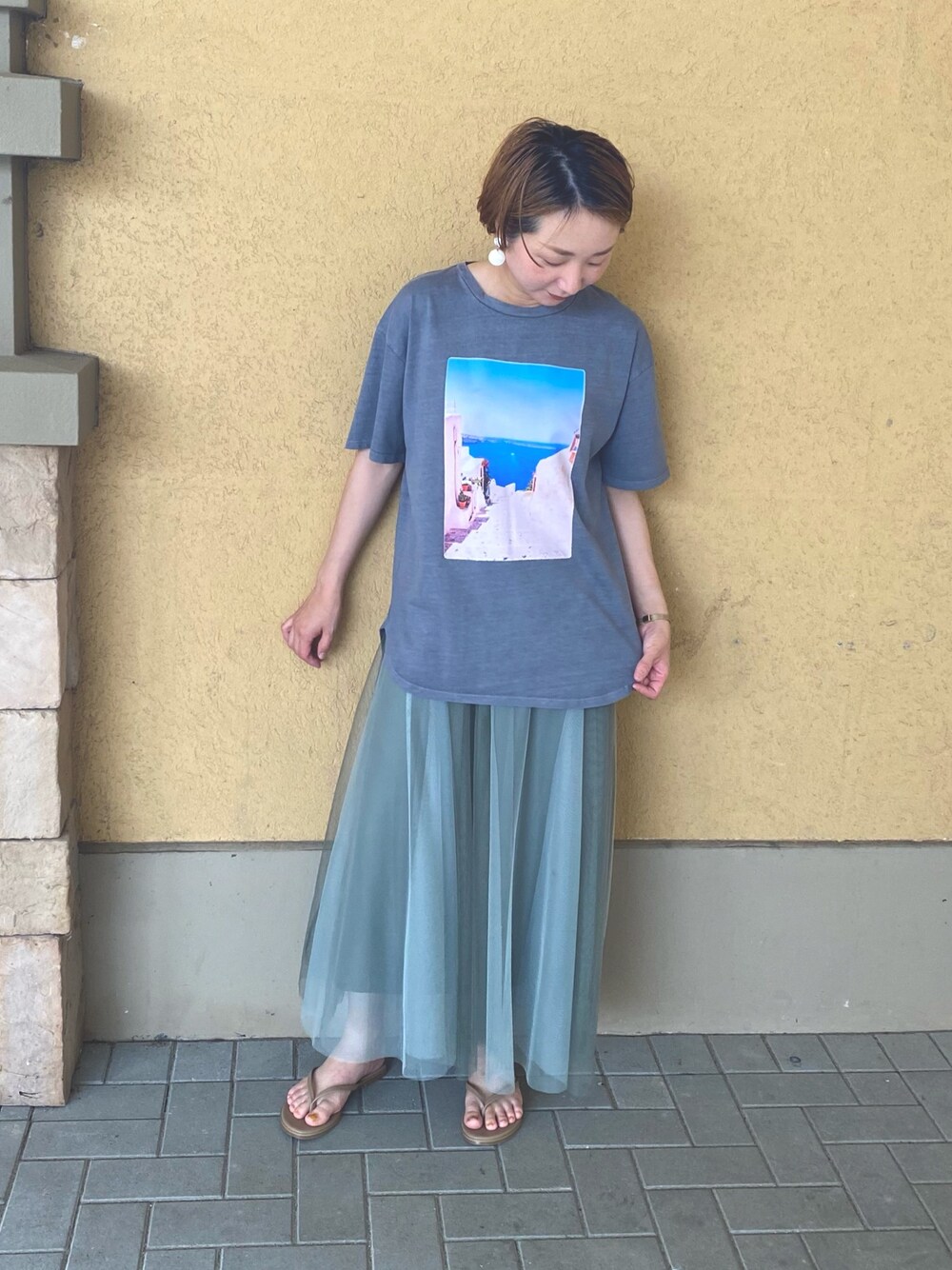 鮮やかなフォトTシャツ。 見てるだけで、癒される。 配色のチュールスカートと合わせて。