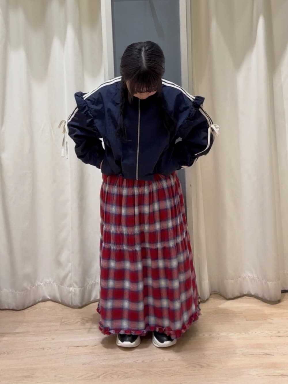フリル、リボン、ラインが可愛い トラックジャケットに 赤チェックのスカートを合わせました^_^ ネイビー×赤の組み合わせは 個人的に最強だ💪🏻と思ってます☺︎ カジュアルなトラックジャケットですが、 フリルとリボンでガーリーさもプラスされているので幅広い年齢の方に着ていただけると思います👍ナイロン素材なのでこれからの季節大活躍間違い無いです♪