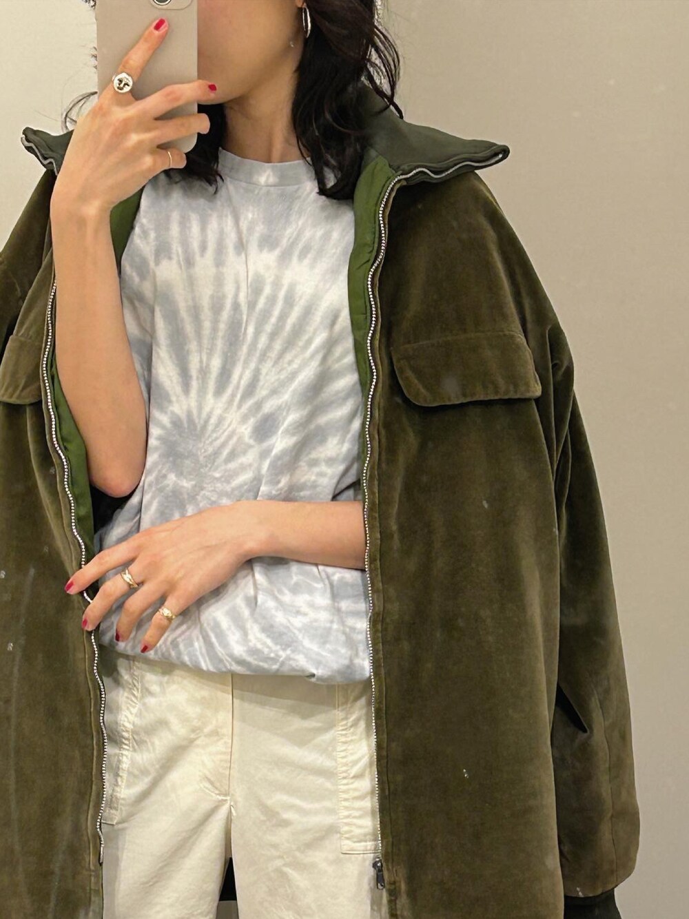 肌寒くてジャケット☁️ 中はタイダイとホワイトパンツで春っぽく🌿