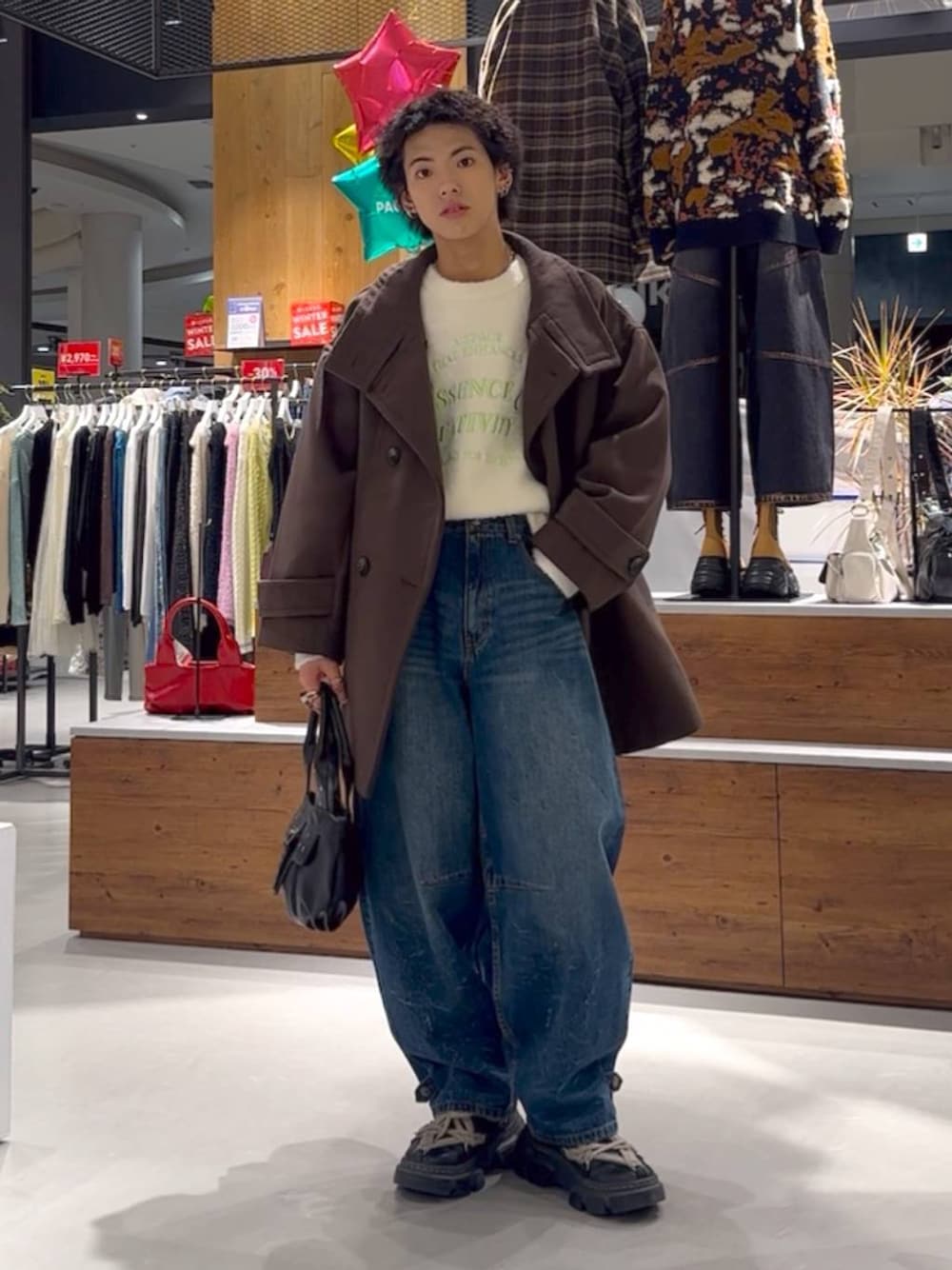 人気のアウターを使って春もいけちゃうコーデ🥳 ブラウンのコートを使って春カラーを使ってコーデを組みました🙆♂️✨️ ブラウンのコートはインナーやボトムにパステル調や明るめのトーンを入れてあげると秋冬以外も使えるのでオススメ‼️ ・ ・ 【アウター】 襟を立てても、前を開けても着れちゃうアウターです❗️ どっちで使っても全然違う雰囲気で着られるから気分に合わせて変えて頂けます🥹 ・ ・ 【ボトムス】 LIMのルーズデニムです! トレンドのバレルシルエットになっているだけでなく、裾のボタンで絞り加減も調節出来ます🥳🥳🥳 加工感もしっかり入っているからトレンドのシルエットに合わせやすいです🙆♂️✨️ ・ ・ インスタも是非ご覧ください😊 ↓