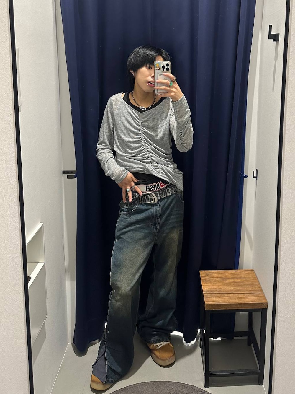 久々Y2Kスタイリング😎🖤 まだまだ続くY2Kトレンド、トップスのサイズ感はジャスト・ボトムスは加工デニムを使えば簡単に出来ます❗️ インナーボトムをチラ見せするのもまだまだ、暑いからこそスタイリングなので出来るうちにやりましょう☘️ ・ ・ 【トップス】 シャーリングになっていて、1枚はもちろん。この後の時期にインナーとして使っても映えそう🤔💭 生地は柔らかいので肌触りもよく、着やすいです🙆🏻♀️ ボタンで、サイドが絞れた風にデザイン変更できるのでその日の気分でぜひ🙌 ・ ・ 【ボトムス】 サイズはR2です! 切り替えがナイロンになっているデニムなので時期によって使い方が変わります! 例えば夏だと吸水性がいいので汗を吸ってくれるし、冬になると風を弾いてくれます🤩 そして、切り替え前・切り替え後どちらも違う雰囲気で楽しめるから可愛い😍 ・ ・ インスタも是非ご覧ください😊 ↓