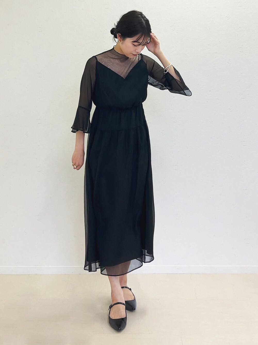 "ラメチュール ハイウエスト パーティードレス" Mサイズ着用💁🏻♀️ さらりとしたシフォン生地で着心地も👍🏻 ウエストも首元も締め付け感はあまりなく、ストレスフリーに着用頂けます☺️💙