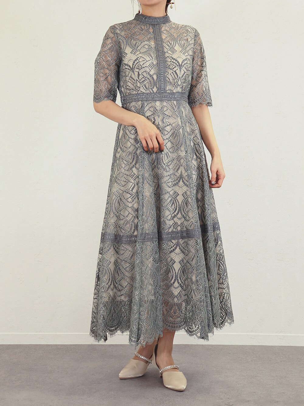 "ラメ×レース ロングワンピースドレス" Sサイズ着用💁🏻 レース生地が清楚で華やかなワンピース ハイウエストでスタイルアップ効果も😳🤍