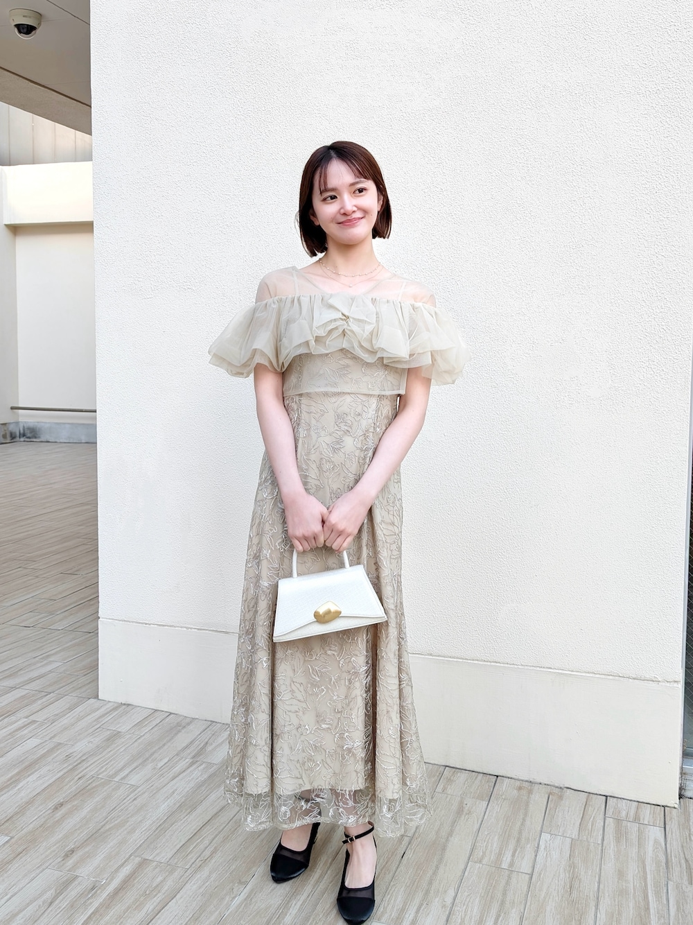 Instagramストーリーアンケートにて 皆さまからお声をいただいてデザインを改良したドレス🪄 今回は、主にチュールボレロのデザインを変更しました! 💡改良ポイント💡 1.チュールの色を全体的に明るく変更✨ より肌馴染みが良く、軽やかで明るい印象に 2.ボレロの前後中央部分にもボリューム追加⤴️ 360度どこから見ても可愛く🫶 3.フリルの部分をランダムにつまんで留める フリルがより立体的に、華やかな印象へ さらにおすすめポイント🫧 ・ボリューム感のあるチュールボレロで 気になる二の腕をカバー ・デコルテのVネックが 華奢見えと抜け感を演出 ・繊細花柄レースが 大人っぽさと可愛さを演出 エアリーなチュールの透明感と可憐な刺繍が 柔らかくも印象に残る大人の女性に💐