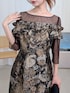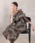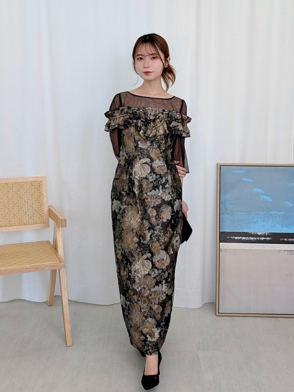 細部まで美しさを追求したジャガードドレス 胸元ハートネックフリルデザインで肩の張りを緩和しエレガントな印象に✨ 👤154cm / 骨格ウェーブ brown / Mサイズ / ヒール7cm