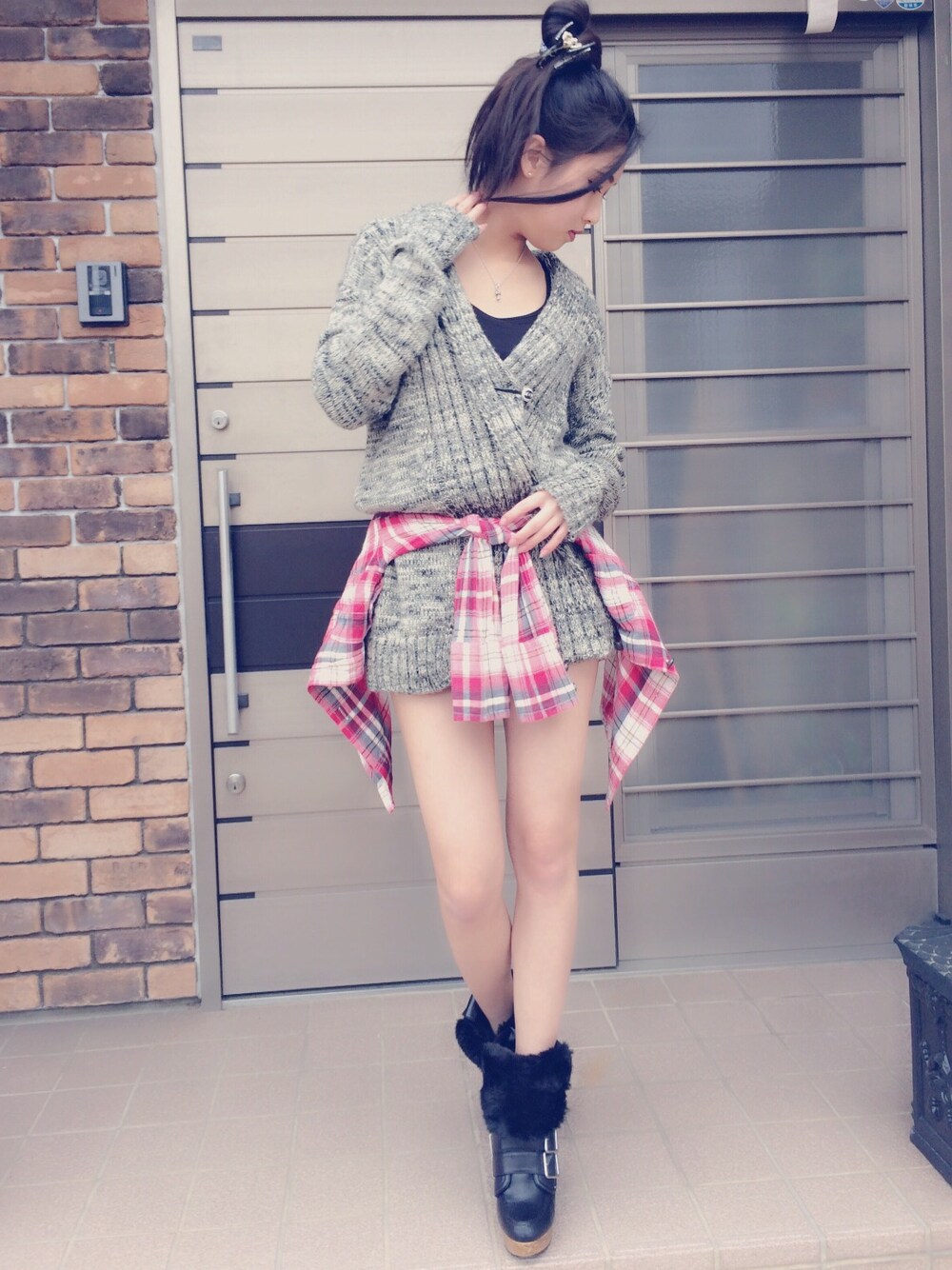 ニットカーディガンをワンピース風に👗 CHANELのピンで前を止めました😘 中は見えないので ショーパンとヒートテックです🙊