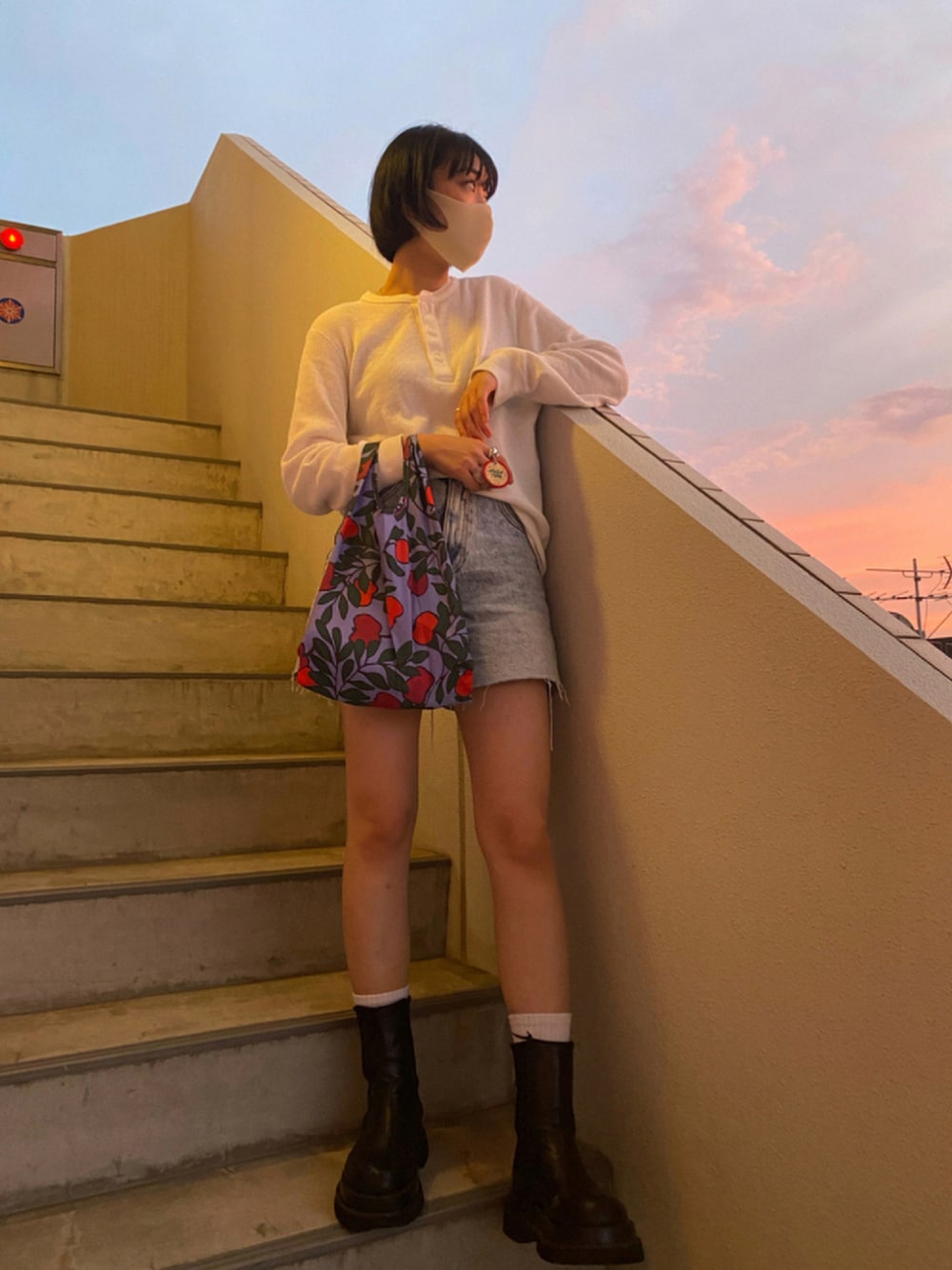 お散歩コーデ🐈🌿 シンプルなのにバッグは柄物を入れておしゃれに☺︎ ふらっとコンビニへ🚶🏻♀️🤘🏻 夕日が綺麗だったからパシャリ📸✨