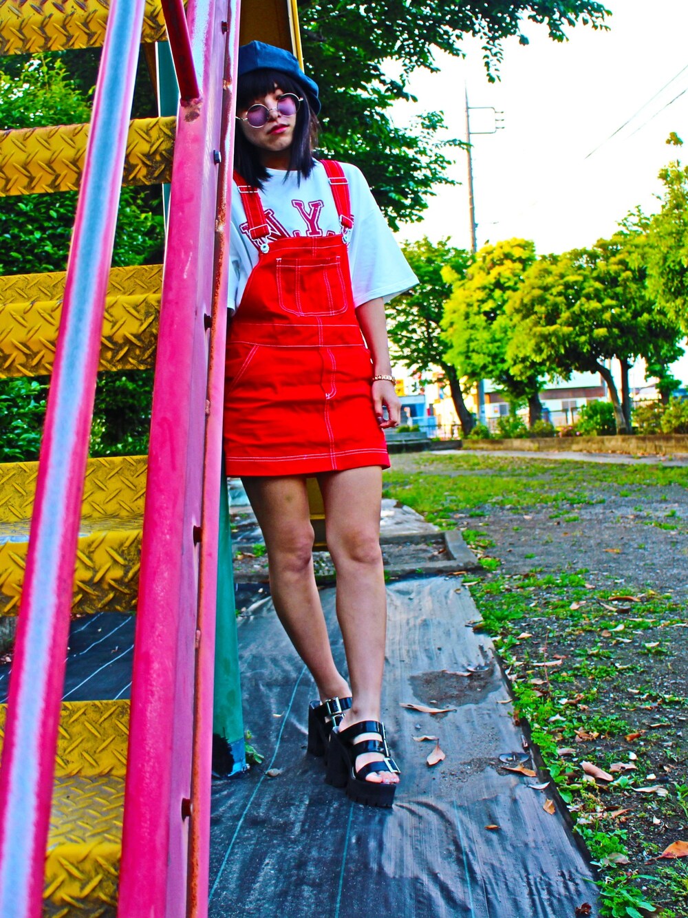 足のあざが目立つ(°_°)(°_°) だいすきなone spoのサロペを 着てみました!丈感がちょうど良くて よきよき🐼◎