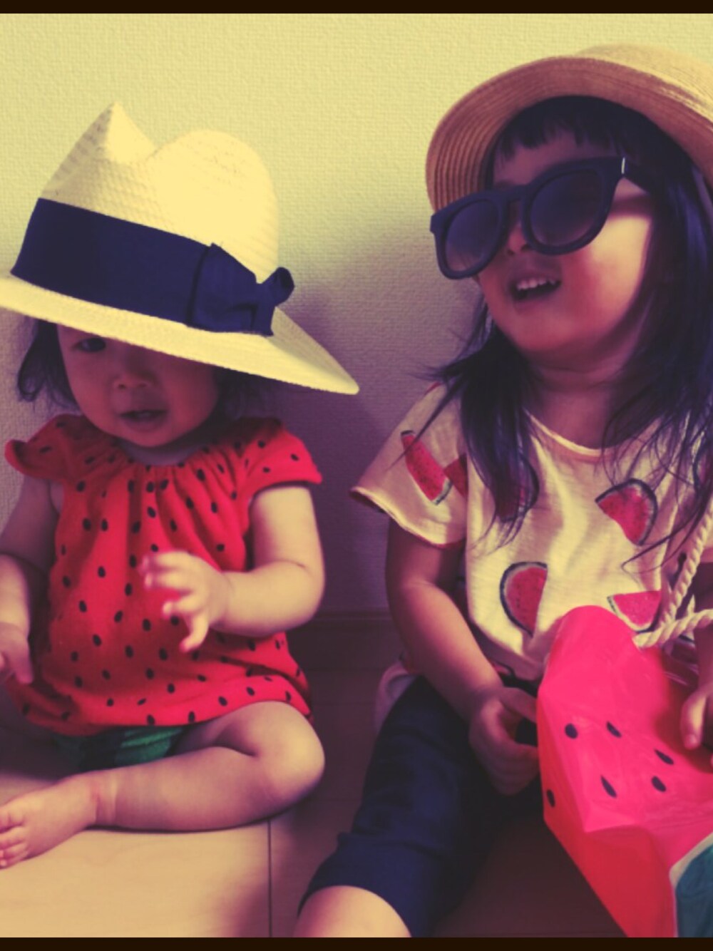 夏の思い出① 2人でスイカコーデ♡ お気に入りの、スイカのプールバック☺︎まだまだ暑いから、これ持ってプール行こう〜! でも、スイカ食べれない長女ちゃん 笑