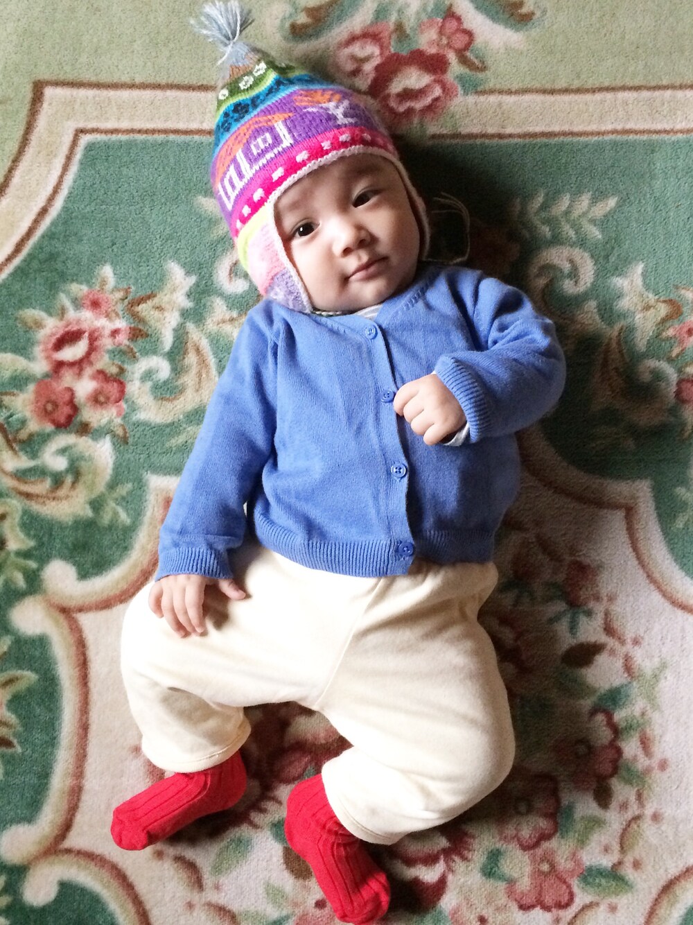 ペルーで買った子ども用ニットキャップに合わせてカラフルカーディガンとパンツで楽しい組み合わせにしました