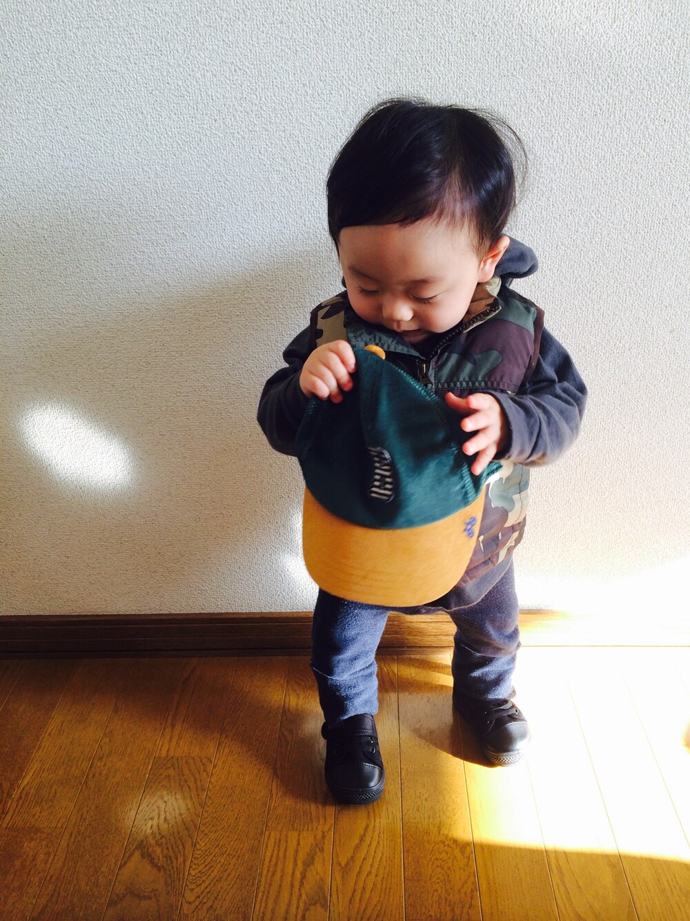 まだ靴履いて外で歩けない人。 ベストじゃ腕が寒いけど着れなくなる前に 着とく。