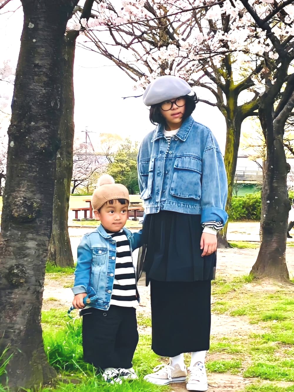 見ていただきありがとうございます♡ いいね♡お気に入り📁コメント✍️フォロー➕どれも嬉しいです🙈💓 #ボーダー #デニム #スニーカー 今年で3年目😳 今年も同じ場所で🌸🌸🌸 りちゅ♡さんとお花見🌸リンクコーデ👫 ボーダー×デニムのモノトーンコーデ🖤🤍 2人ともおっきくなったなあとしみじみ🥲