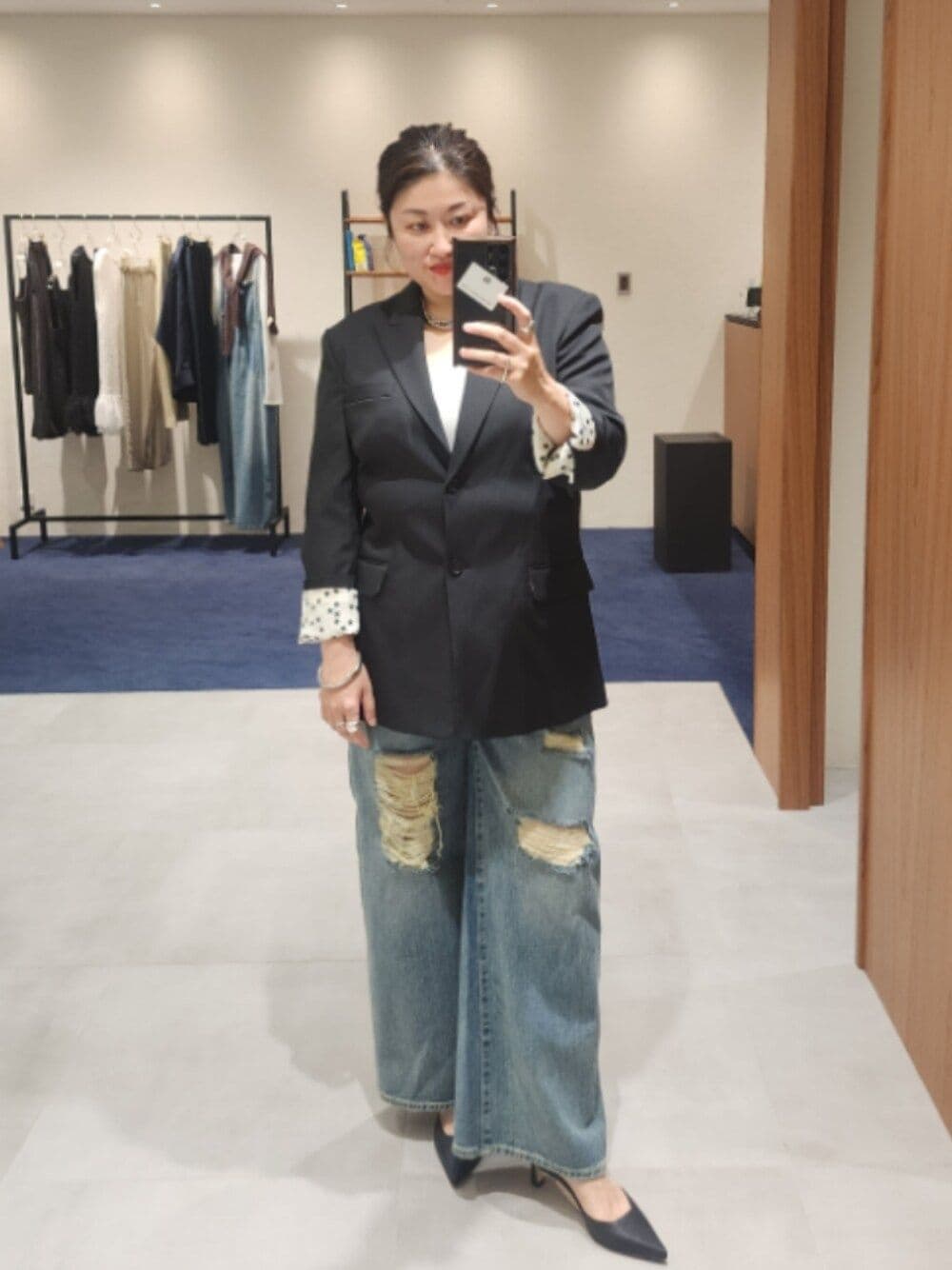 20周年限定アイテムが登場! ジャケットは肩パッド入りのトレンドアイテムで、BIGシルエットでも着やせて見える神アイテムです。星柄のの裏地がシンプルなコーデのワンポイントになります! ハンサム好きにおすすめな合わせはワイドデニムパンツのスタイルです。ダメージデニムがおしゃれさんにマストなアイテムです!素材もかたすぎず、着心地も◎! GALENAのアクセもシルバーで統一して靴はパンプスで大人カジュアルコーデが完成!