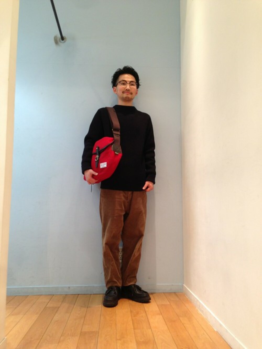 ウェアを落ち着いたお色でコーディネートして、バッグの赤を差し色にしてみました。ハリスツイード素材のBRADY、英国らしさが全面に出ていて素敵です!