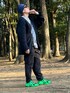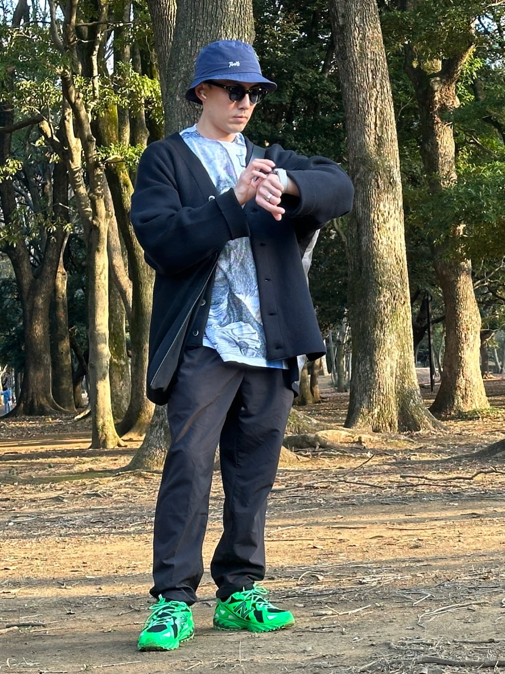 まだ肌寒いので、厚手のニット。 グリーンのスニーカーがワンポイントです。