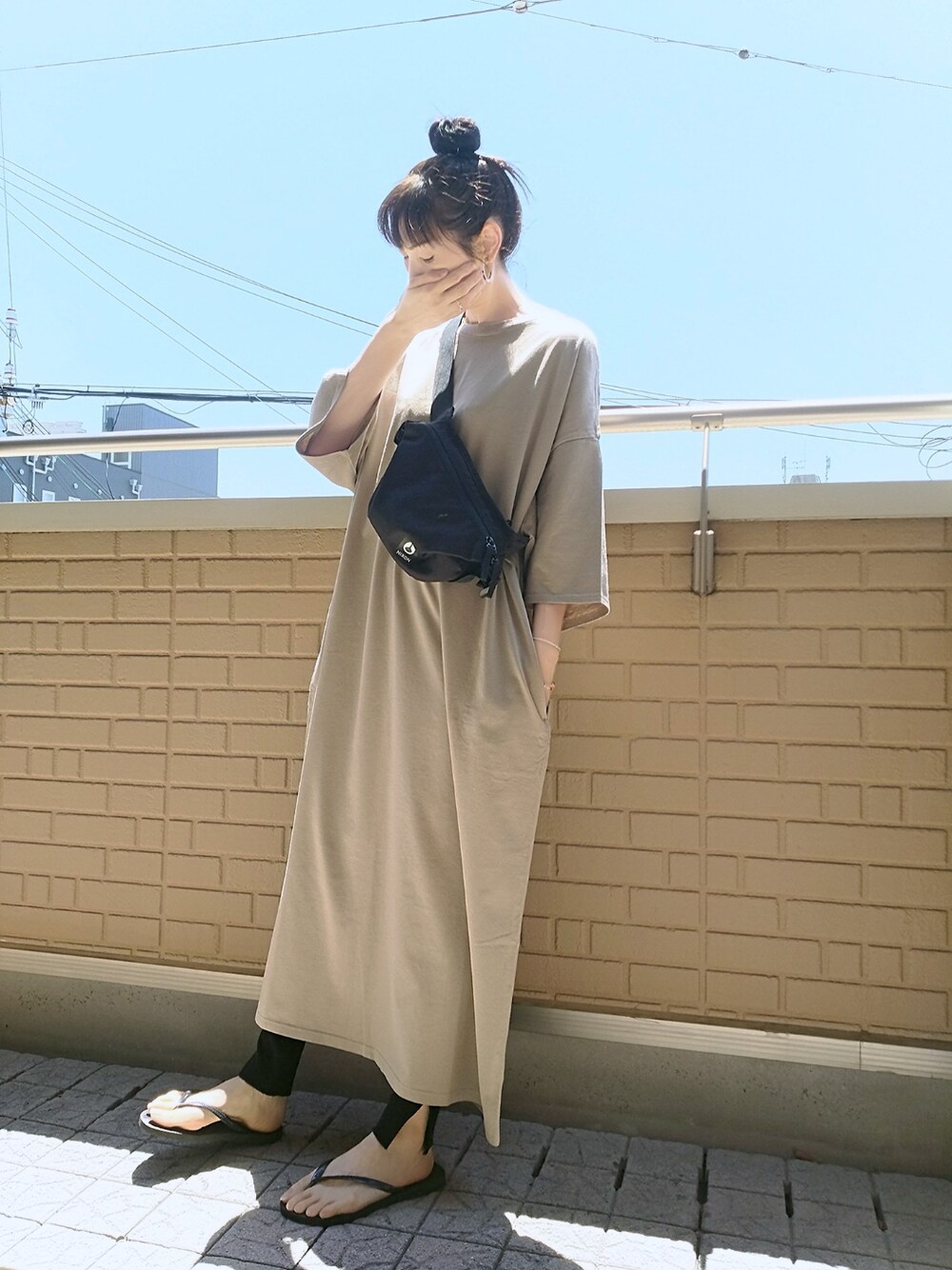 Tシャツワンピ×スレギンス ベージュのTシャツワンピスに黒のスリットレギンス+フラットサンダル(ビーサン)とボディバッグの黒で引き締め 海老フライ&ハンバァァァーーーグ(小窓) 肉汁じゅわ~な所を撮ろうとして失敗w