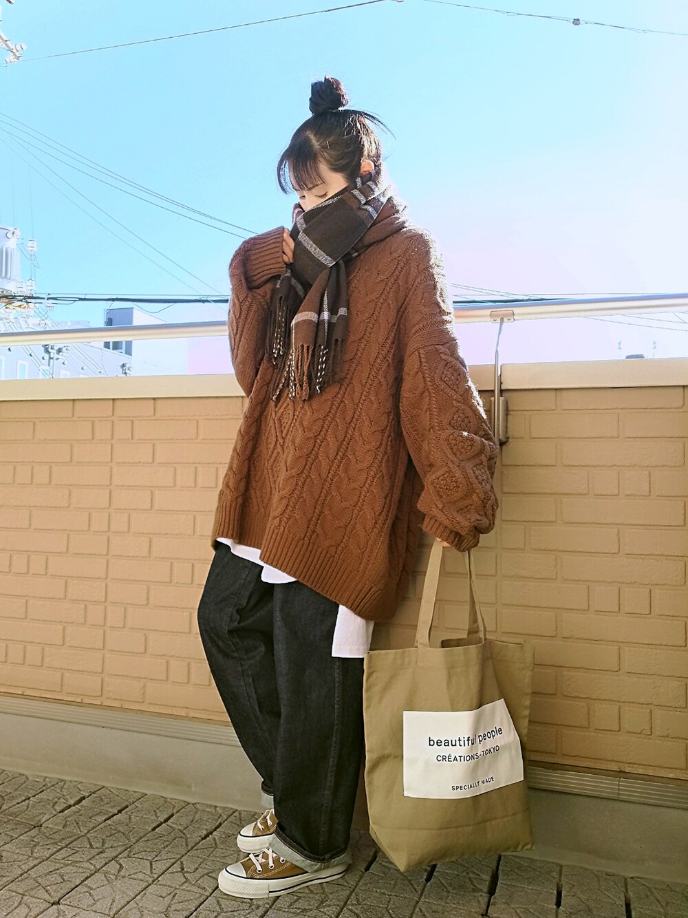 チェックストール×ケーブルニット オーバーサイズでさらに袖がびろーんと長いケーブルニットはアシンメな白Tとレイヤード ストールはボリュームの出るミラノ巻きで埋もれる 2019→2020(小窓) 帰省して早々にリストアップしてたお土産の買い出しでビタミン補給にホットレモネードを飲んで、元旦に引いたおみくじは大吉(๑•̀ㅂ•́)و✧