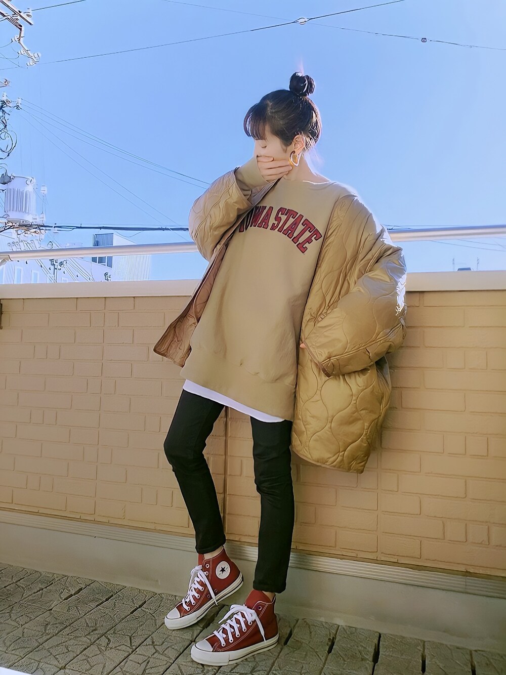 キルティングコート×スウェット ノーカラーのキルティングコートは抜き襟でゆる羽織り 白Tとレイヤードしてるのはオーバーサイズのスウェットは古着のチャンピオン ロゴに合わせてコンバースのカラーもバーガンディ お歳暮(小窓) 地元の友達からお歳暮のハムが届いたので我が家も週末にお歳暮を各地に発送 早速とどいた友達から「あまーい」「美味しい!」と今年も喜んでもらえて一安心♪(ت)