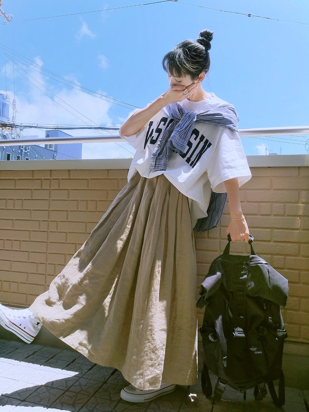 カレッジロゴT×リネンスカート マキシ丈のリネンスカートにカレッジロゴTをゆる~くブラウジングして古着ショップで見つけたオーバーサイズのストライプシャツを肩掛け Tシャツのテイストに合わせて足元はハイカットコンバースにバックパック コンビニスィーツ(小窓) 多分たべるのは2回目のファミマのりんご&カスタード シャキシャキなリンゴにカスタードクリームとシナモン風味のクランブルがウマw あと載せるのすっかり忘れてた抹茶スィーツ 次は時期的にレモンかチョコミントかしら( ´-` ).。oO